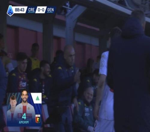 比赛末段,热那亚主帅德罗西让替补席上的亚历山德罗-阿莫林起身,准备换下弗伦德鲁普。转播图像显示了两人的名字与照片:弗伦德鲁普配的是本人照片,但阿莫林那一栏却“画风不对”——头像并非年轻的热那亚中场亚历山德罗-阿莫林,而是前曼联主帅鲁本-阿莫林,他不久前刚被曼联解雇。