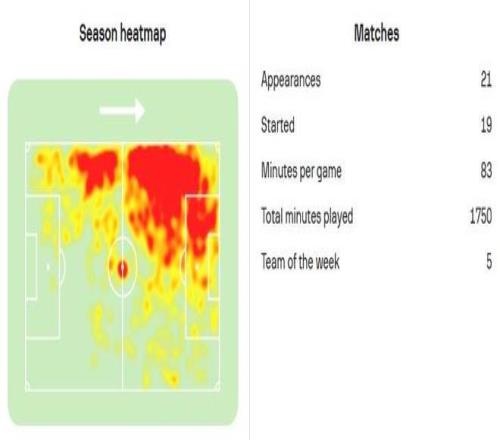 如果现在再回看迪亚斯的参与进球和参与制造得分机会完整点位图,你会发现,迪亚斯最有威胁的时间主要集中在下半场前半段和后半段,这两个足球比赛尤为关键的时期。本赛季,拜仁在落后或胶着的比赛中,迪亚斯贡献7球4助,独造11球,占球队胶着局进球数的42%。迪亚斯的所有数据,都是在全德甲所有球员压力值最大的情况下取得的,即便这样他也竟然也值是本赛季德甲场均评分第二的左边锋,但所有数据都能证明迪亚斯有一颗大心脏。