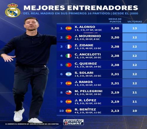 随着时间的推移,足球历史在不断书写传奇,而皇马的教鞭更是交替着不同的名字,成就着一段段辉煌的篇章。最近,德国转会市场对自2000年以来皇马主帅在前16场比赛中的胜利场次进行了统计,令人瞩目的是,阿隆索以13场胜利高居榜首,让人感受到这位年轻教练的潜力和才华。
