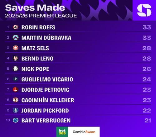 此外,在摘高空球方面,罗埃夫斯同样以14次并列联赛第一。(另一位为纽卡门将波普)。本赛季至今,罗埃夫斯已经贡献了4场零封,扑出过1次点球,并且根据他所面对射门的质量统计,他为球队 减少了约2.94个失球。