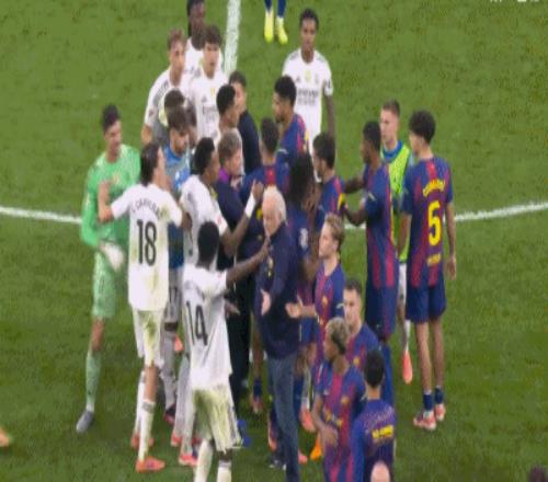 卡瓦哈尔最后对亚马尔说:“要是你废话太多,今天有你受的。” 亚马尔被激怒,开始隔空叫阵,队友们赶忙围上来护住他,对方球员则直接与他正面对峙。亚马尔隔空朝着几名对手连喊“有种出去碰碰”,直到维尼修斯在返回更衣室途中(远远地)与他交错,维尼修斯对着他比划“话太多”的手势,亚马尔直接“约架”更衣室。维尼修斯闻言立刻转身狂奔接受挑战,但最终被人拦下。