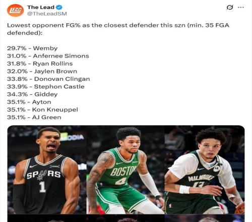 值得关注的是,文班亚马还有2项数据高居联盟第1。第1、文班亚马场均送出4.8次封盖,排名联盟第1。第2、美媒The Lead列出了一项防守数据统计,本赛季在防守对位时让对手投篮命中率最低的球员(至少防守35次出手)排行,其中文班亚马(29.7%)排在第一。