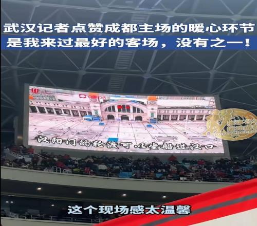 “成都是我来过的最好客场,没有之一。”今年年初的揭幕战中场休息时,球场开启“友城互动”环节。现场响起武汉球迷熟悉的《汉阳门花园》,大屏幕播放武汉城市宣传视频。数百名远道而来的武汉球迷深受感动,感受到宾至如归的温暖。随后,武汉广电文体在线发布记者张曦视频报道此温馨场景。该视频迅速走红网络,点赞数超7500,评论近1400条,被众多官媒、自媒体及网友广泛转发,引发热议。