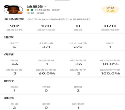 迪亚洛在防守端的表现同样可圈可点,他有着1次抢断和2次解围。