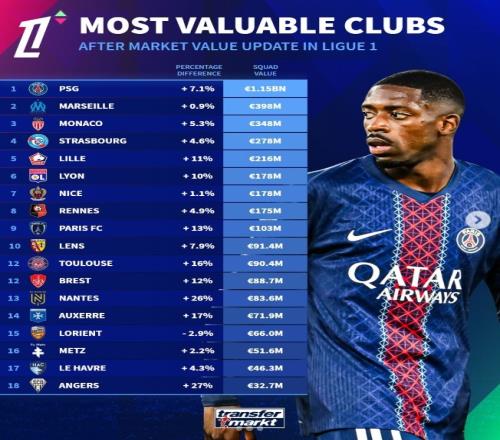 看看马赛的身价,3.98亿欧元,连个零头都不够的样子。摩纳哥以3.48亿欧元位列第三,仿佛是在说:“我们也是贵族,只是贵得稍微少一点。”后面的球队群星闪耀,但还是显得暗淡无光。斯特拉斯堡、里尔、里昂等队伍的身价区间在2亿至1.78亿之间,硬币的另一边真是比拼微不足道。