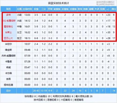 雷霆(主队):亚历山大17分2板6助、霍姆格伦13分5板1助3帽、杰伦·威廉姆斯11分4板3助、华莱士9分4板2助4断、多特9分2板、米切尔7分3板1助、维金斯3分1板1助、卡鲁索3分1板、肯威2分、杰林·威廉姆斯2板2助