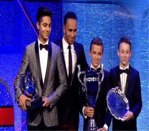 这并不是诺里斯第一次在FIA颁奖典礼捧杯,上一次他的身份是卡丁车车手,而给他颁奖的则是老汉...