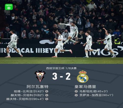 北京时间1月15日西班牙国王杯 1/8决赛,阿尔瓦塞特对阵皇家马德里。上半场,比利亚尔率先破门。赫伊森头球被扑出,马斯坦托诺补射扳平比分。下半场,贝坦科尔破门帮助主队再次领先。居莱尔开出角球,贡萨洛头球再次扳平比分,不过随后贝坦科尔完成绝杀。全场比赛结束,皇马2-3不敌阿尔瓦塞特,被对手淘汰出国王杯。