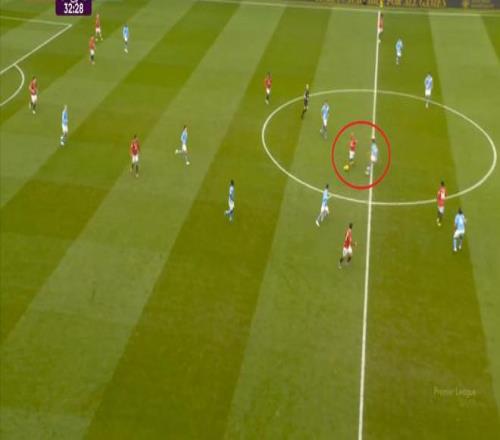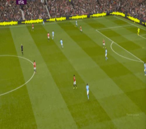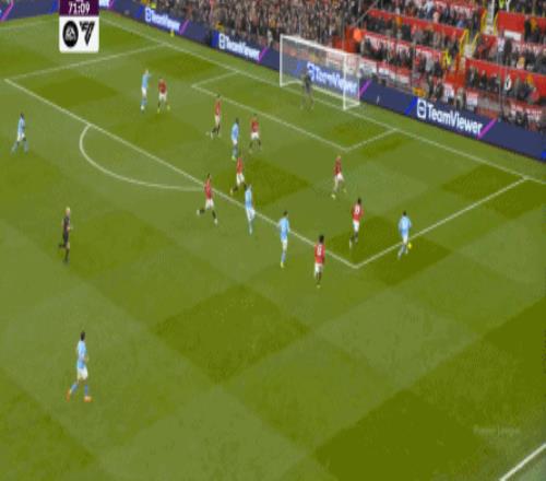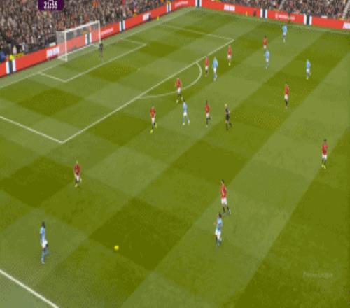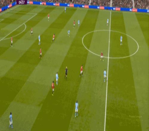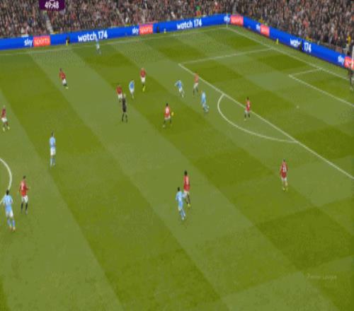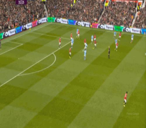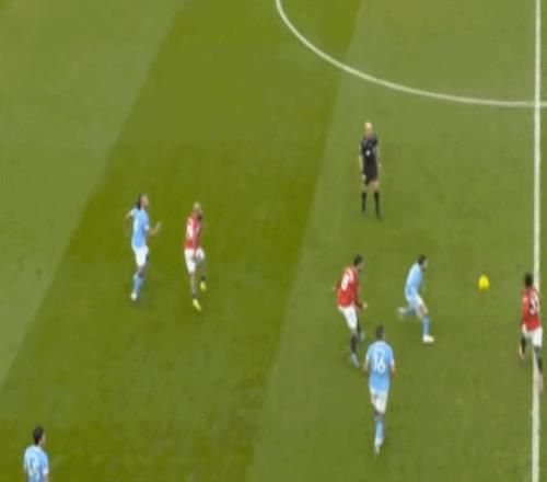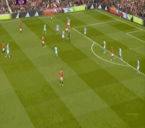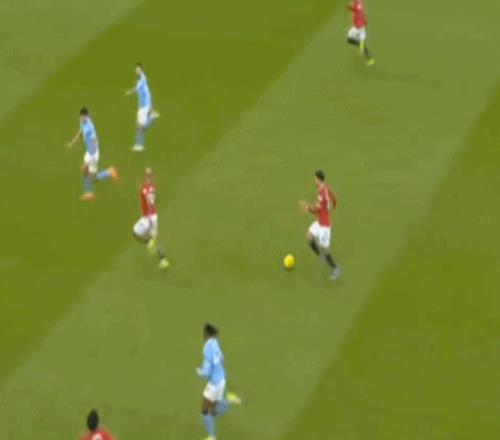 这是曼联在本赛季一直都有的赛程优势,之后也会延续下去,但你会看到,哪怕是在前场,在这次进攻里,布鲁诺甚至可以在禁区线前先想后传,曼城都没有及时给到压力: