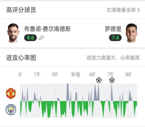 这个时候,你再来看曼联和曼城在“进攻心率图”上的表现: