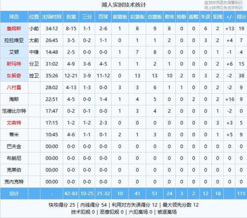 东契奇38分13板10助2断、詹姆斯19分9板8助、斯玛特15分2板1助、八村塁9分6板1助、海斯9分5板2帽、蒂米9分3板、拉拉维亚7分1板2助、文森特5分、艾顿4分8板、范德比尔特4板2助