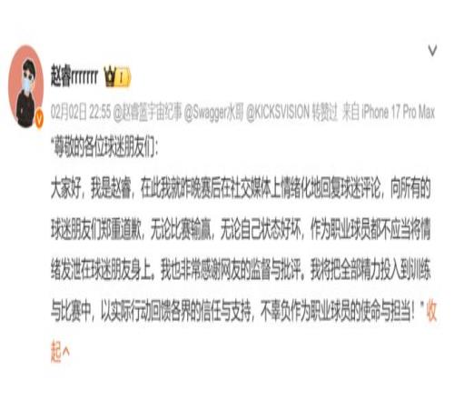 如此一来,赵睿终于又惹祸了,昨天一整天之内都有很多人去找他,跟他强调这个问题的严重性。终于在昨天傍晚,赵睿公开道歉,但还是被质疑不够诚恳,并没有专门向新疆球迷道歉。