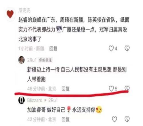 结果在赛后,气急败坏的赵睿打开了个人社媒账号,开始跟球迷对线,其中就瞄准了IP在新疆的球迷,开始胡乱说话,一下子引起了新疆球迷的愤怒。更为关键的是,赵睿的措辞出现了很严重的错误,他针对的不仅仅是球迷,而是更广大的群体。