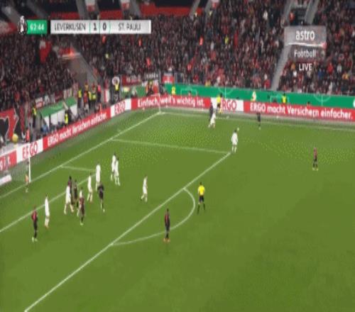 第31分钟,泰里耶凌空抽射,皮球直挂死角,勒沃库森1-0圣保利