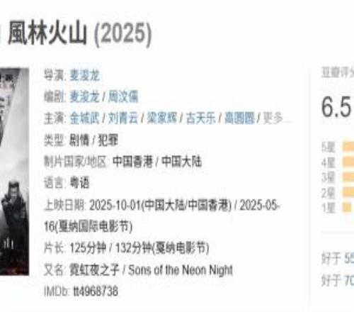 体育资讯10月2日称 今日,电影《风林火山》豆瓣评分解禁,截止发稿前,豆瓣评分6.5分。