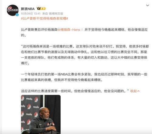 杨瀚森季前赛糟糕表现发酵,开拓者队记表态,教练说出心里话