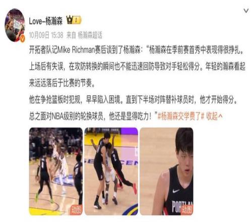 在比赛结束之后,开拓者球队的记者谈到了这次杨瀚森的具体表现,大概的意思就是说他认为杨瀚森在本场比赛打的非常的挣扎,各方面的速度和节奏都匹配不上,甚至在有些时候做挡拆还挡了夏普他们的进攻路线。这些细节其实都表明,杨瀚森和其他的队友磨合还不够默契度。还没有达到很好的程度。
