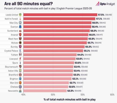 近日,权威统计机构opta公布了英超20队的净比赛时间占比,纽卡斯尔联、切尔西和曼联是倒数前三名。每场足球比赛开始前,总会让人心头微微一颤,因为没人知道接下来的90多分钟会发生