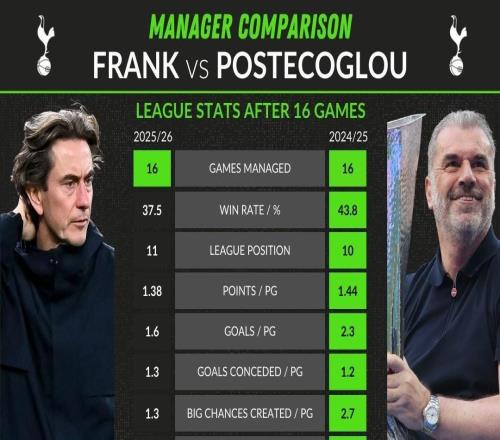 客场0-3不敌诺丁汉森林后,托马斯-弗兰克在北伦敦所承受的压力进一步加大,这赛季球队的比赛风格以及糟糕的主场战绩已经让球迷的不满情绪不断升温,Whoscored也对比了弗兰克本赛