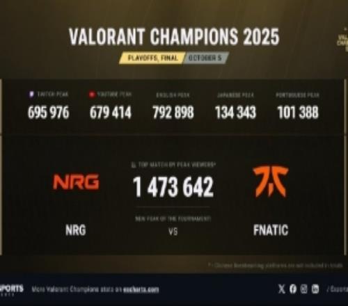体育资讯10月8日称 据国外Esports Charts数据网站统计,瓦罗兰特巴黎全球总决赛的峰值观众为147w,不及CS2 Major和英雄联盟MSI。 CS2的上个Major
