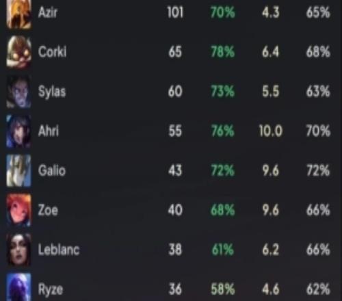 Chovy英雄使用情况:沙皇101场70%胜率,飞机65场78%胜率