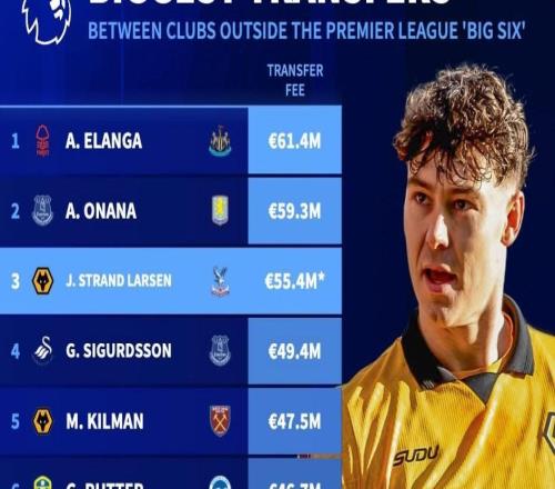 北京时间2月3日,德转统计出了英超历史除BIG6以外最贵的10笔交易,纽卡斯尔联去年夏天6140万欧元从诺丁汉森林引进埃兰加排名第一,今年冬窗水晶宫转会费加奖金总价5540万欧元从狼